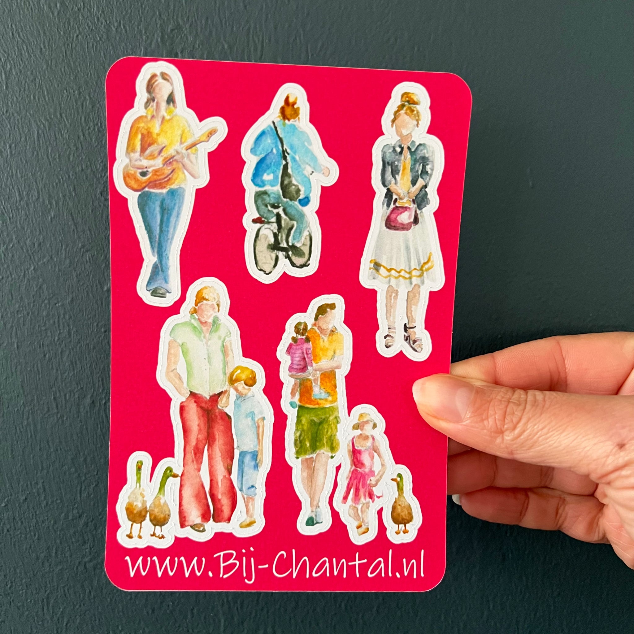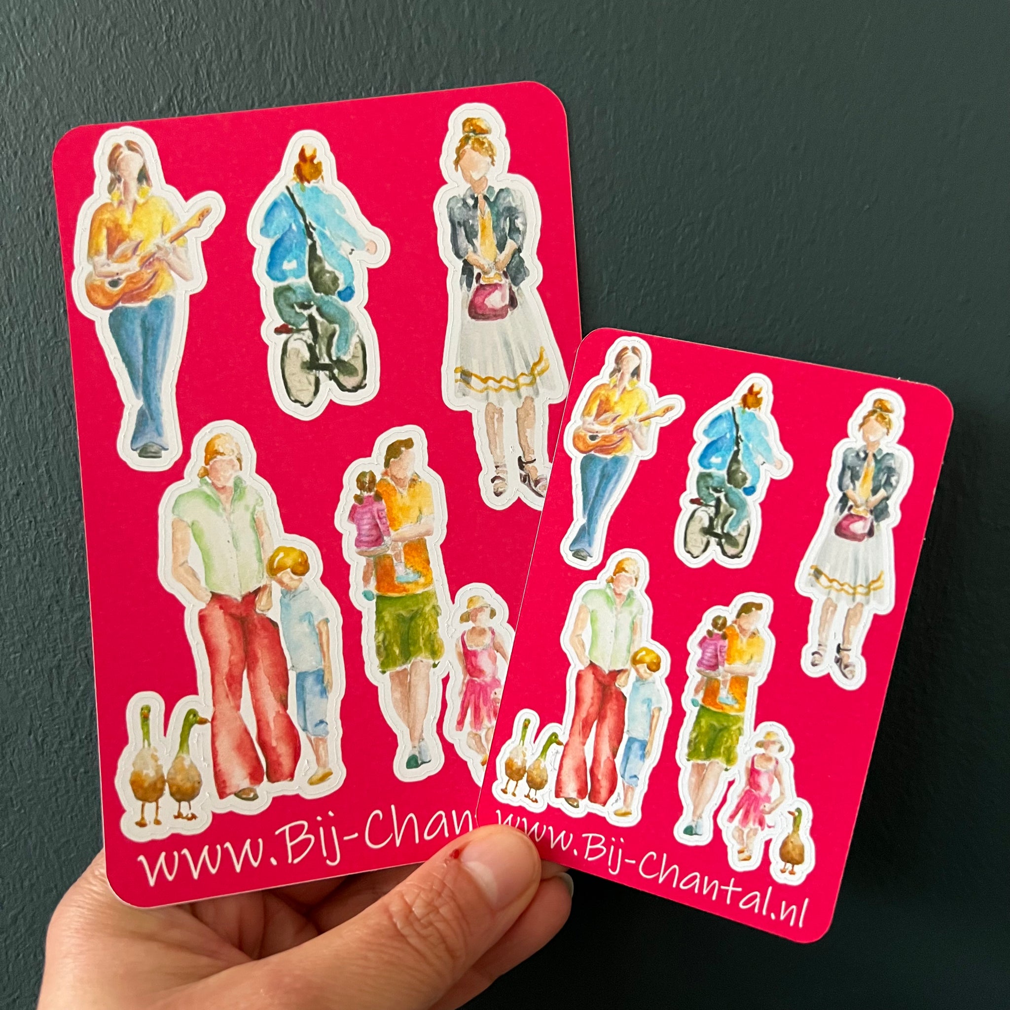 Een stickervel met mensen! Hoe leuk is het om die herkenbaarheid van elkaar te zien. Ik heb deze tekeningen uit mijn schetsboeken verzameld en als stickervel afgedrukt.